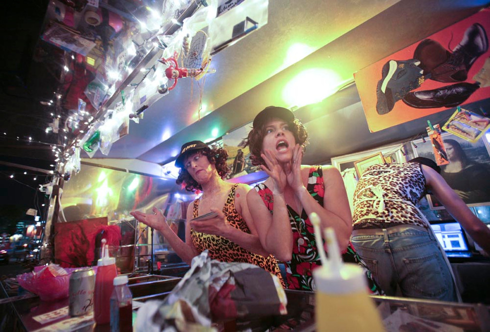 In our Fast Art Trailer,the Fast Art Girls (2009) traded ideas about Art, Value, and Viennas, along with a range of **exclusive** and **authentic** artworks. Visitors could order from a menu offering a selection of pre-printed combo’s (eg: a hamburger with your favourite artist in it + a free famous signature of your choice on the side). You also had the option to ‘Put Yourself Inside a Famous Artwork’ or to purchase DIY kits including: ‘Instant Art, Instant Fame’ and ‘Make a Genius Art Child’. Every purchase came with a free cold Vienna wrapped in a page from The Art Times, with mustard and tomato sauce.